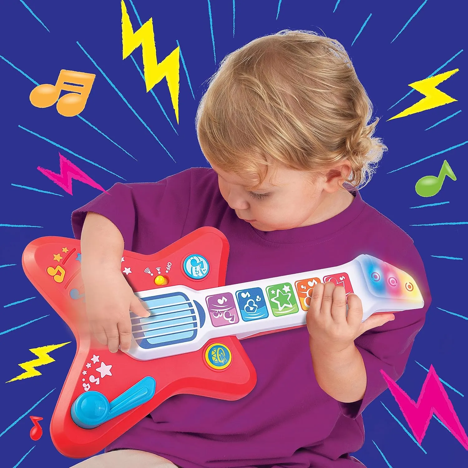Cuenta con una guitarra de colores brillantes con sensor táctil y sonidos realistas de guitarra eléctrica.