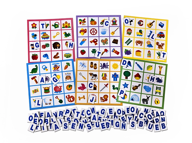 Un colorido bingo que estimula el reconocimiento de las primeras letras de cada dibujo. La identificación de la letra inicial es uno de los primeros índices que los niños utilizan para escribir o reconocer palabras.