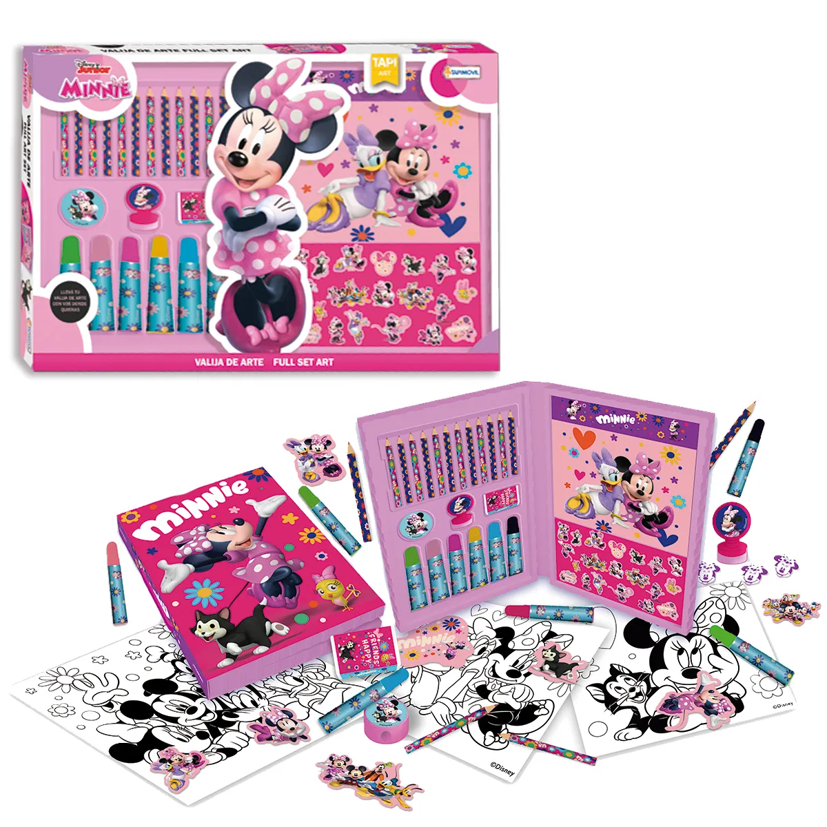 Incluye: 1 Valija plegable, 6 marcadores, 12 lápices de colores, 1 block de 20 hojas para colorear con imágenes de Minnie, 1 goma, 1 sacapuntas, 1 sello y stickers.